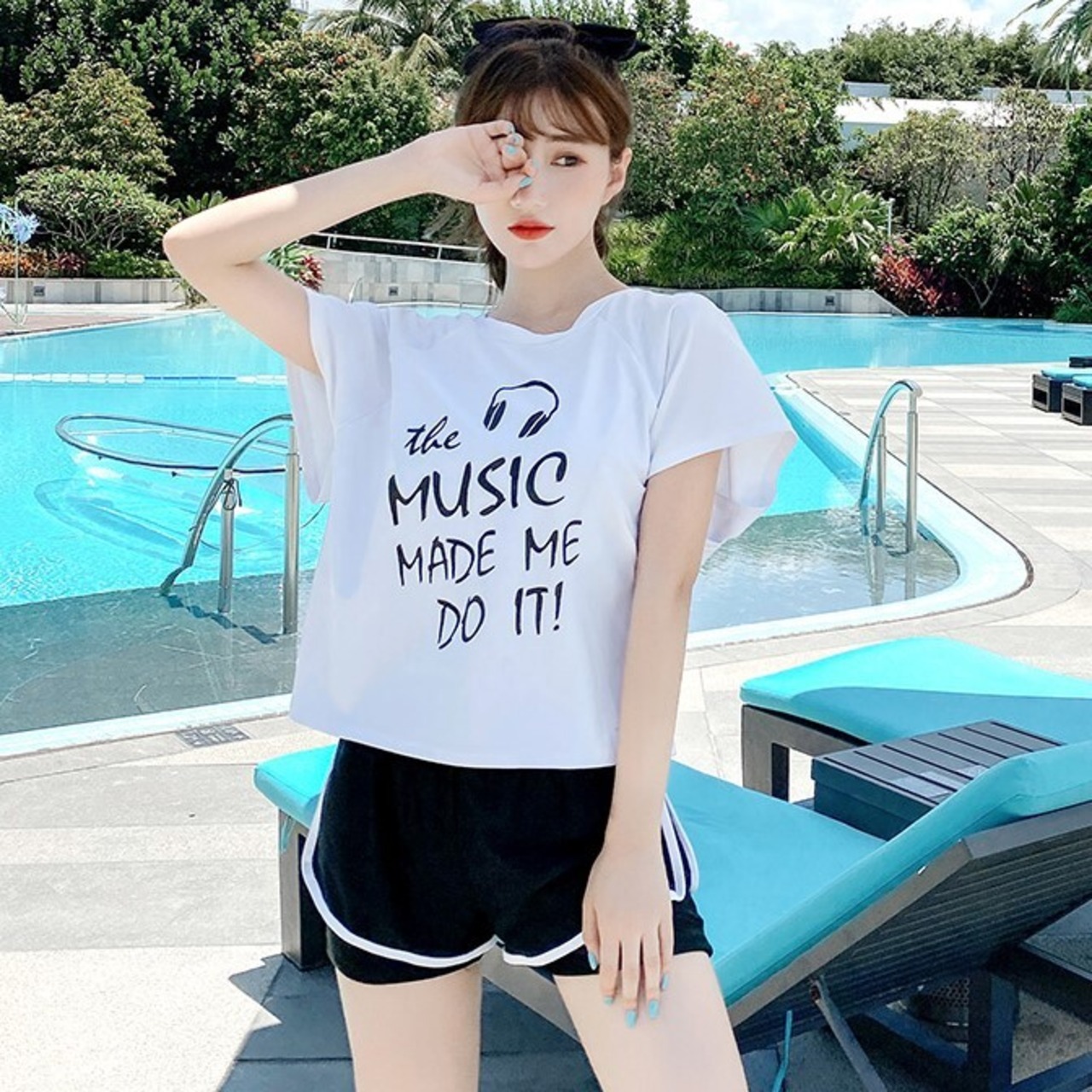 ブラックとホワイトのスポーティーでオシャレな、ラッシュガード付きのスリーピース。