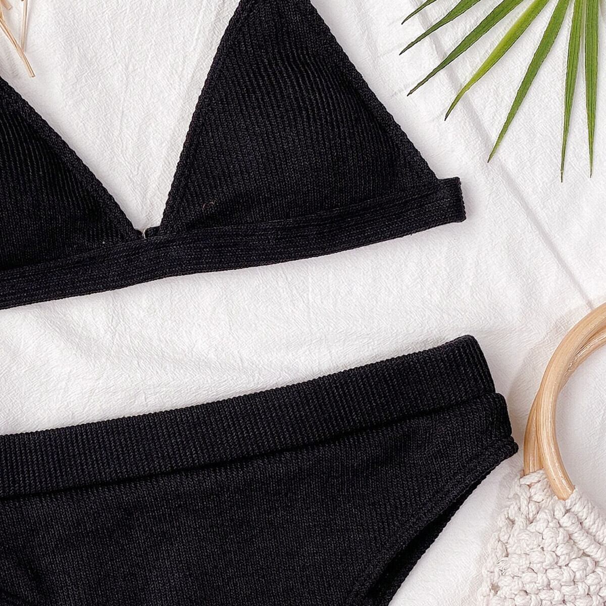 水着 パッド付き 三角ビキニ ハイウエスト 可愛い フェミニン スイムウェア 無地 シンプル 黒 海 ビーチ プール 海水浴 リゾート ママ 水20 水30 小さいサイズ