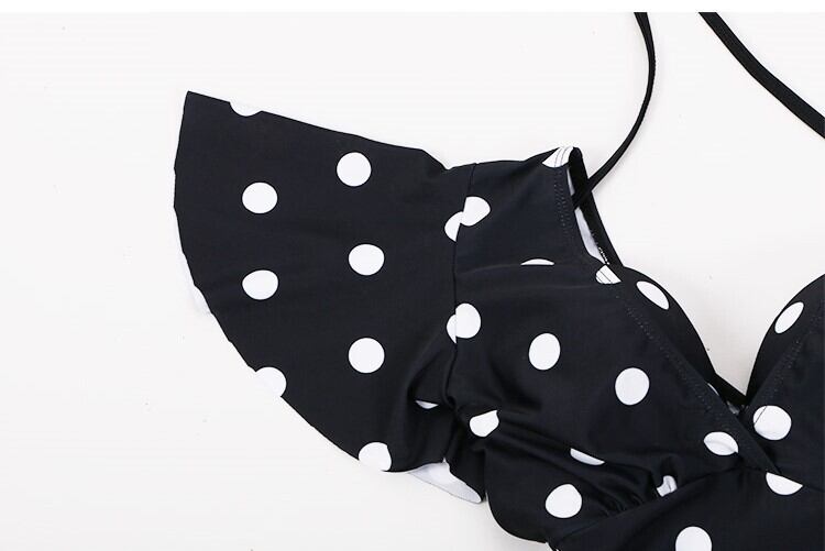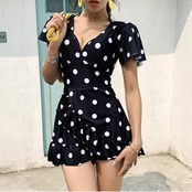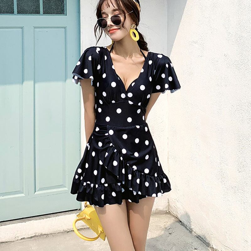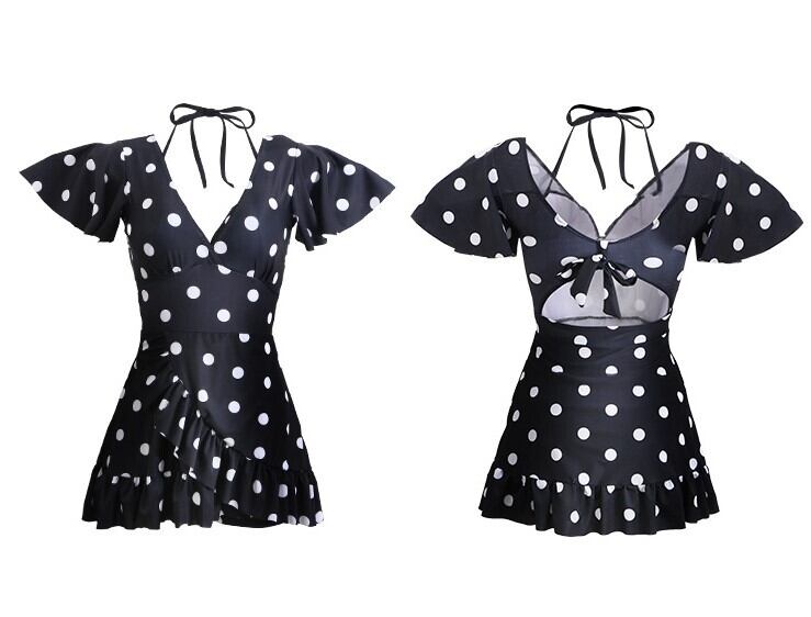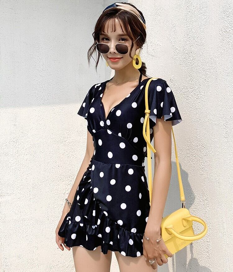 レトロなドット柄が目を惹く、ワンピースタイプの水着。