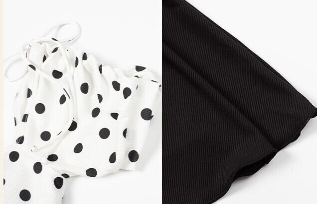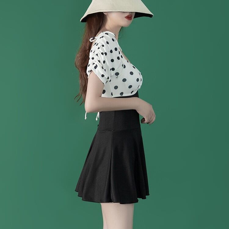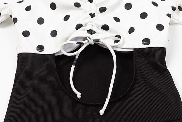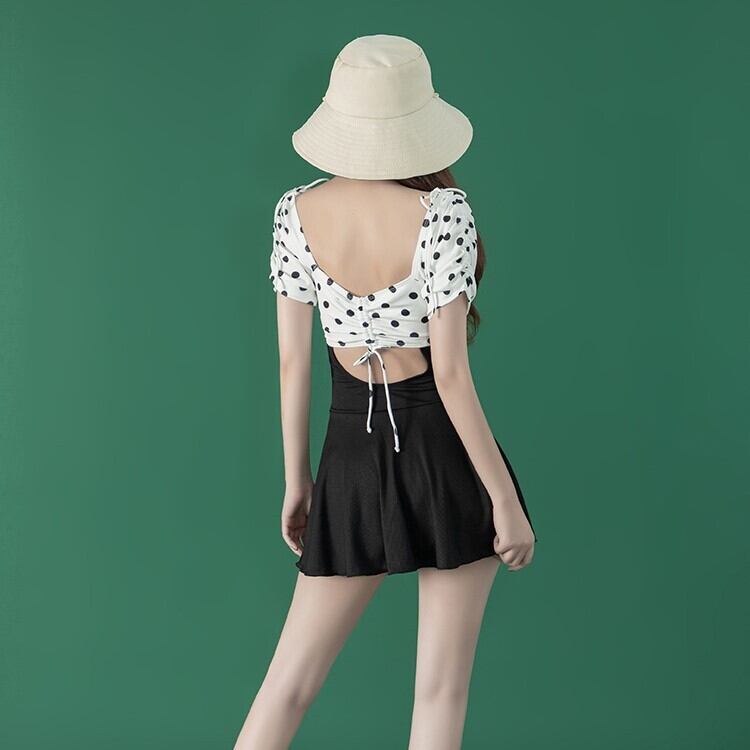 黒と白のドット柄が大人かわいい、ワンピースタイプの水着。