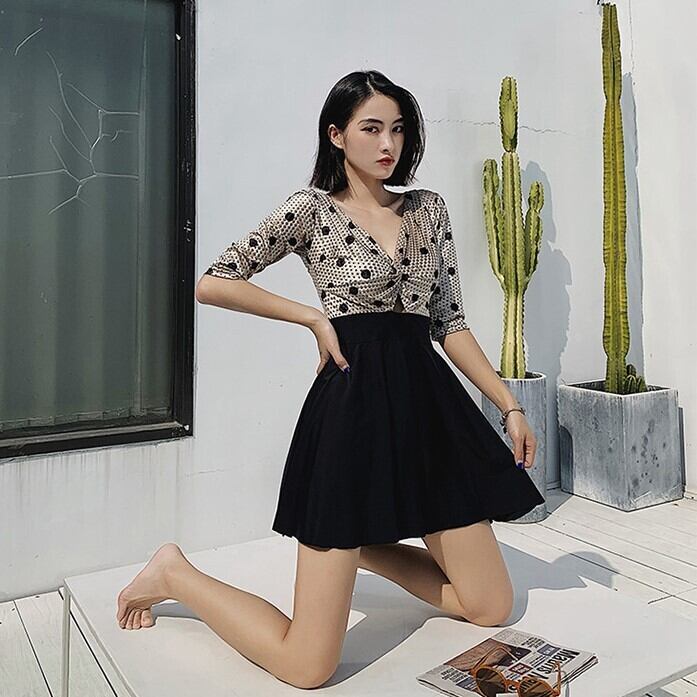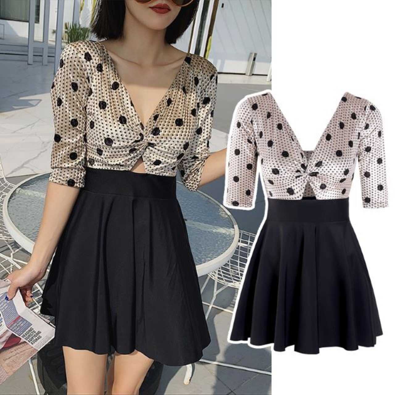 大人っぽさのある上品なドット柄の、ワンピース水着。