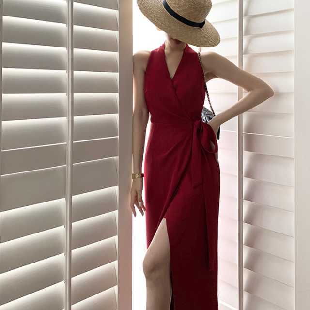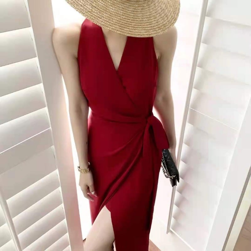 深目のVネックとロングスリットがとってもセクシーな大人のワンピース。