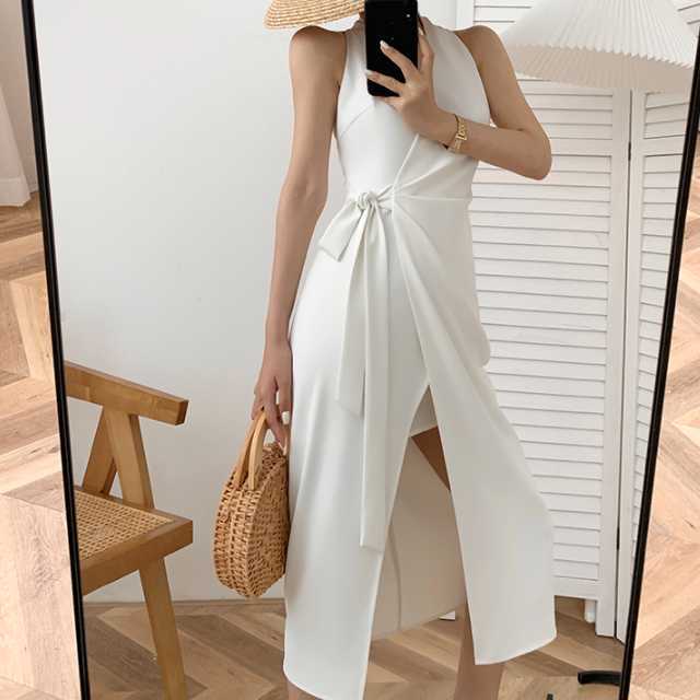 ワンピース スリットワンピース パーティードレス ミディアム スリット マキシ丈ワンピース Vネック スタイル ブラウン セクシー ミディワンピース マキシ ウエストマーク リボン セクシー きれいめ キレセク