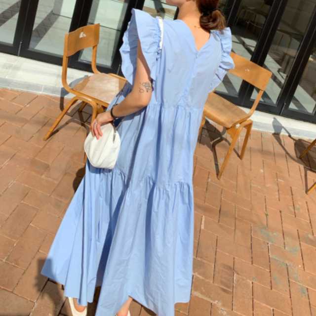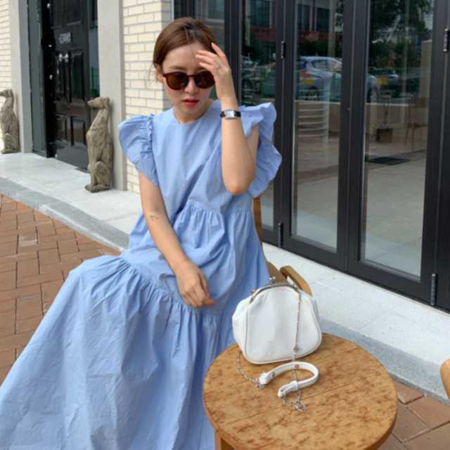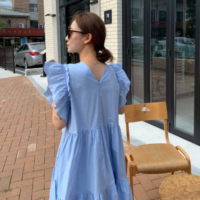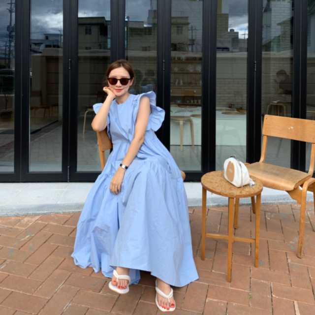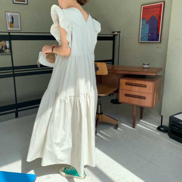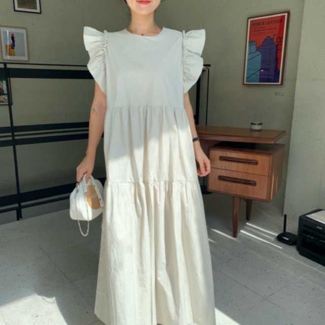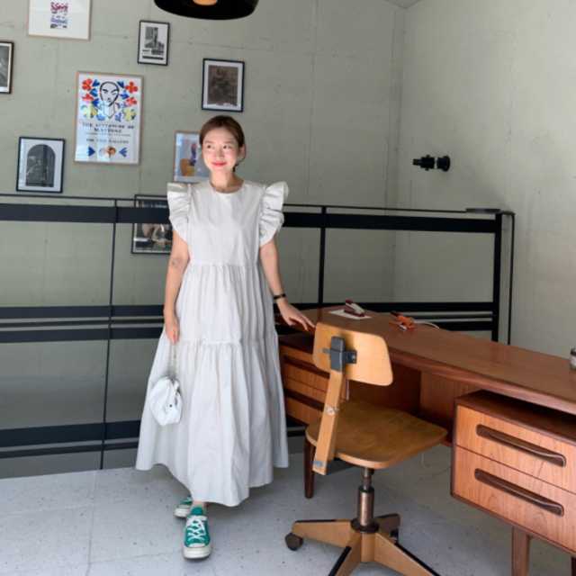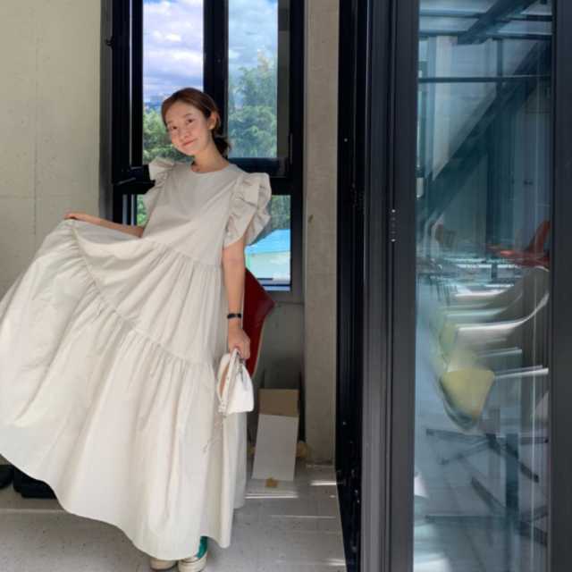 大きなショルダーフリルが二の腕の細見えを叶えてくれるかわいいワンピース♪
