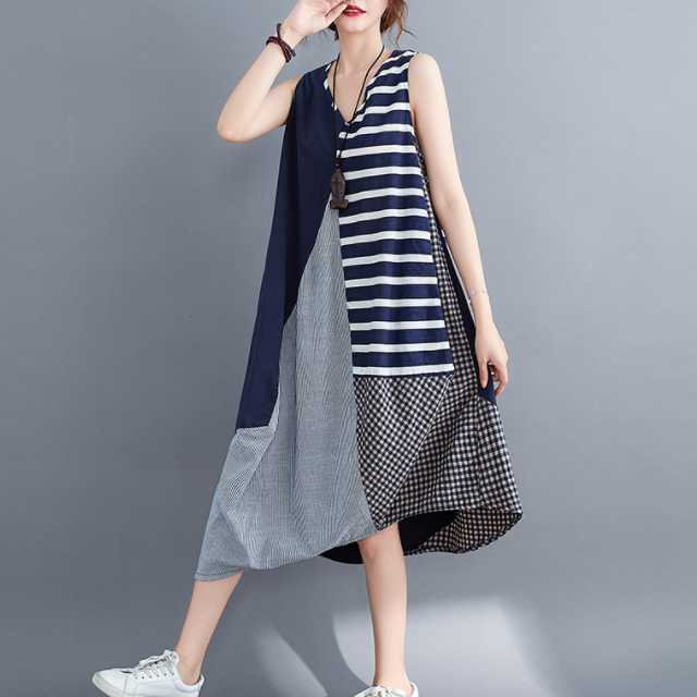 ワンピース パッチワークワンピース カットソーワンピース ミディアム丈 ミディアムワンピース レディース 春夏 カットワンピ ノースリーブ Aライン アシンメトリー ストラップ パッチワーク キレセク