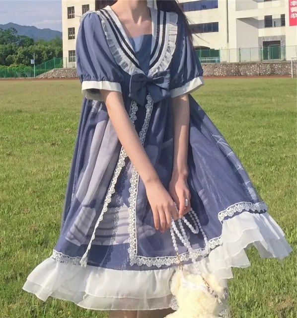 カジュロリ 森ガール 可愛い 半袖 セーラー風 ワンピース Aライン OP フリル 夢かわ
