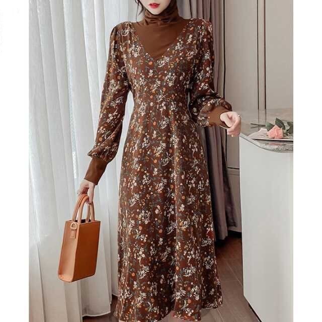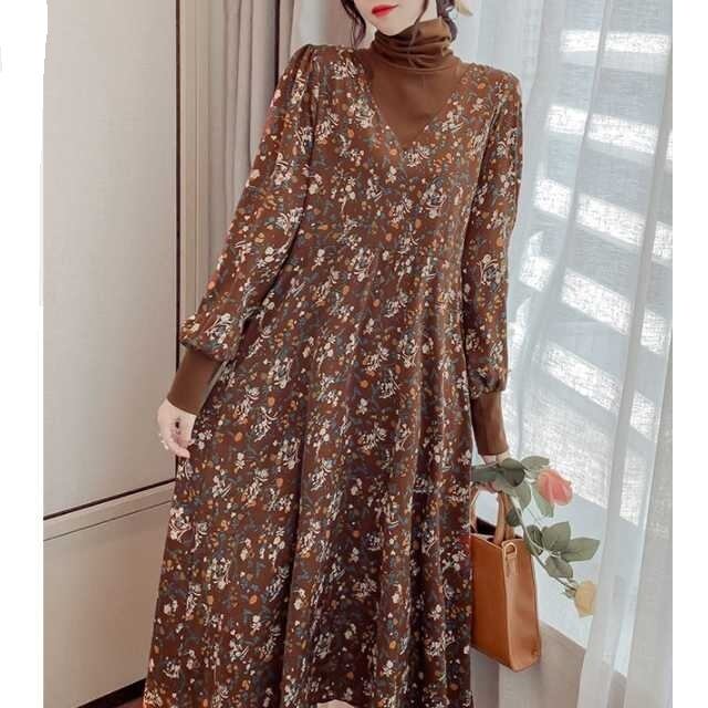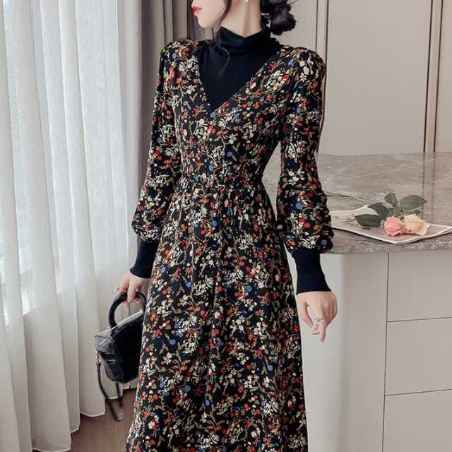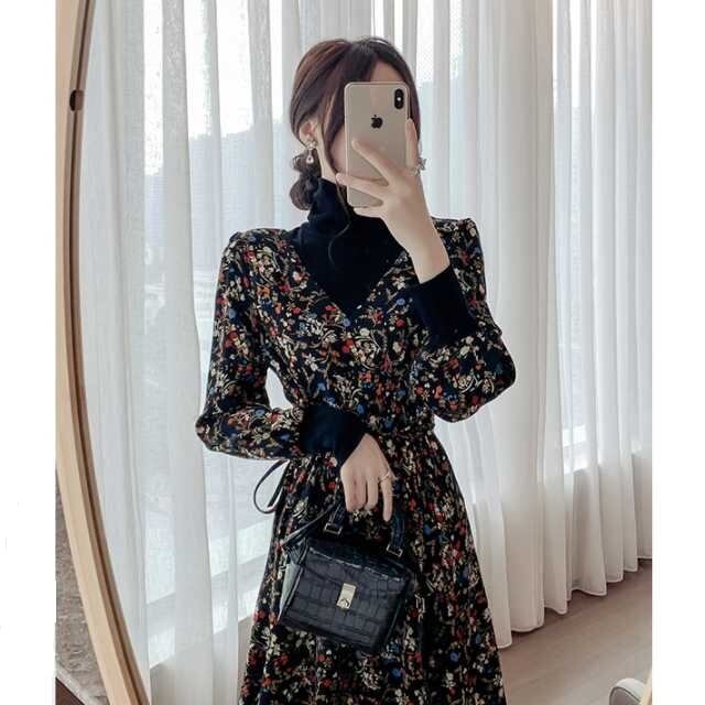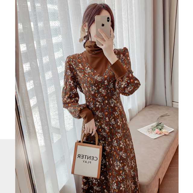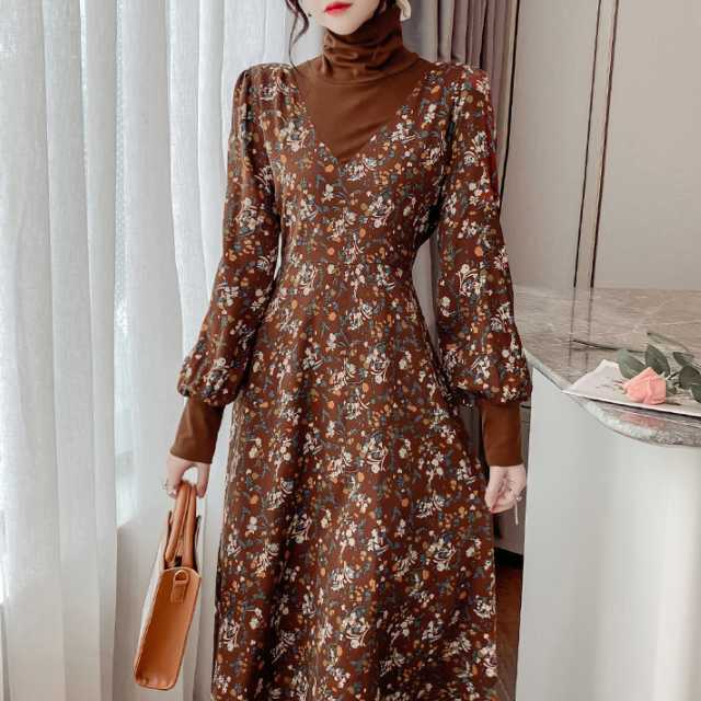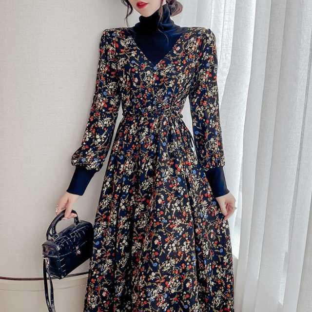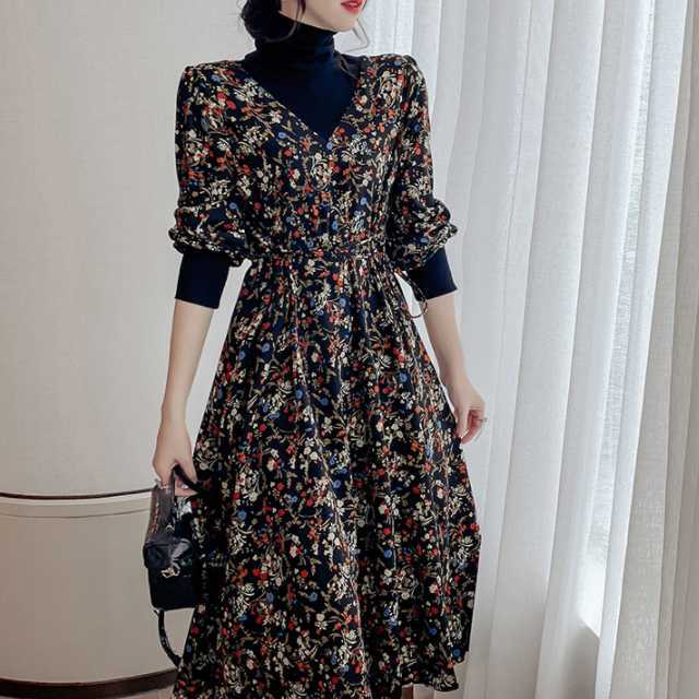 ワンピース ロングワンピース ミモレ丈ワンピース ロング 重ね着風 ハイネック タートルネック スキニータートルネック スエード フラワー 長袖 花柄 プリント Aライン キュート オリエンタル 大人かわいい キセレク