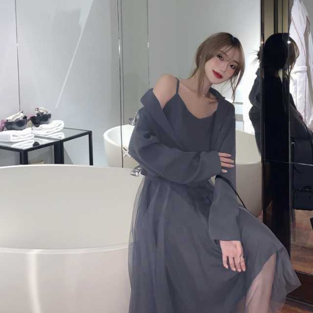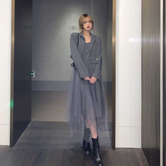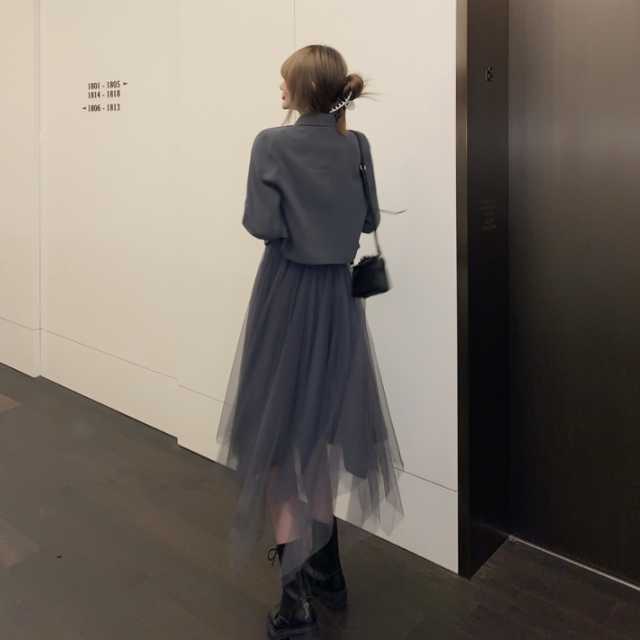 セットアップ スーツセット レディース 2点セット コート スカート チュールスカート ロングスカート 長袖 無地 大きめ 20代 30代 デイリー 着痩せ 2色 体型カバー フェミニン キレセク