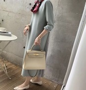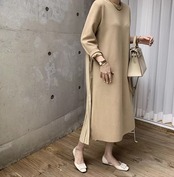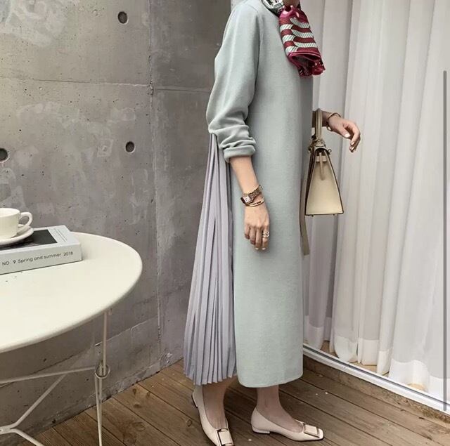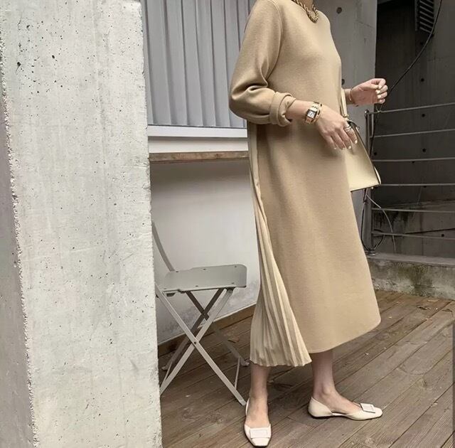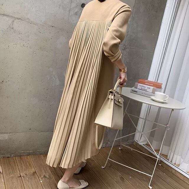 《入荷待ち》切り替え 長袖 ラウンドネック レディースファッション 秋冬 バックプリーツ 大人可愛い カジュアルファッション マキシ丈 プリーツ特集