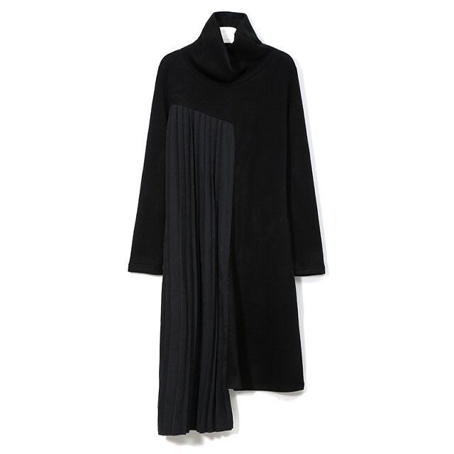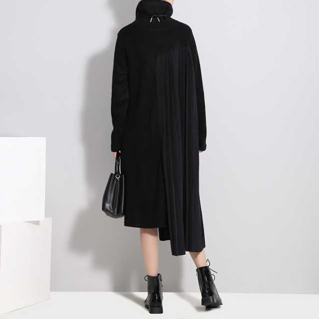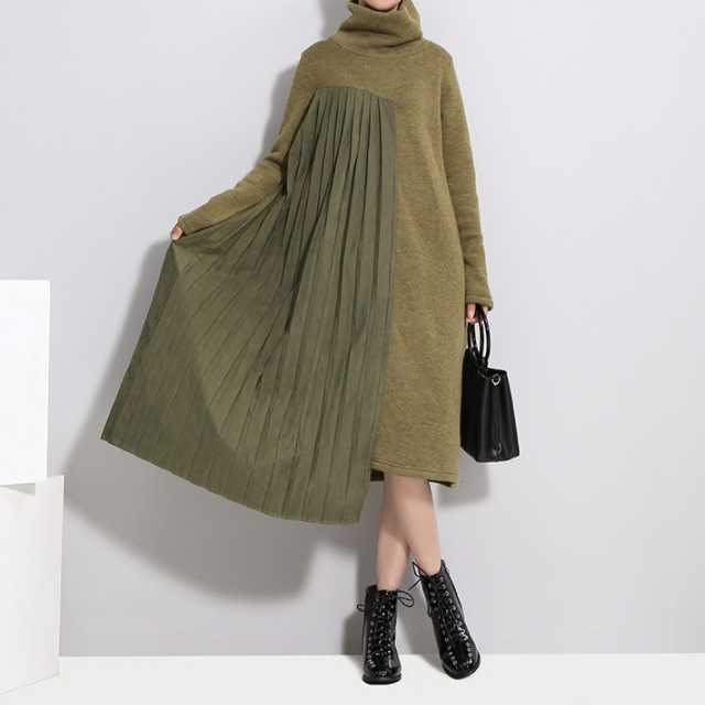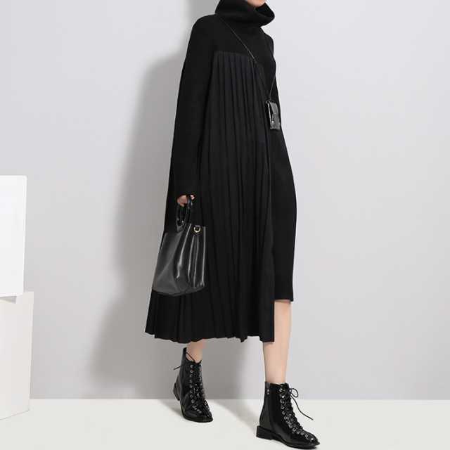 ワンピ―ス ロングワンピース 長袖 ロング 切替 プリーツ レディース Aライン ハイネック 異素材 モード ボトルネック タートルネック 大きいサイズ 全2色 キレセク
