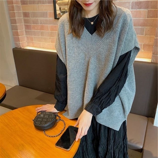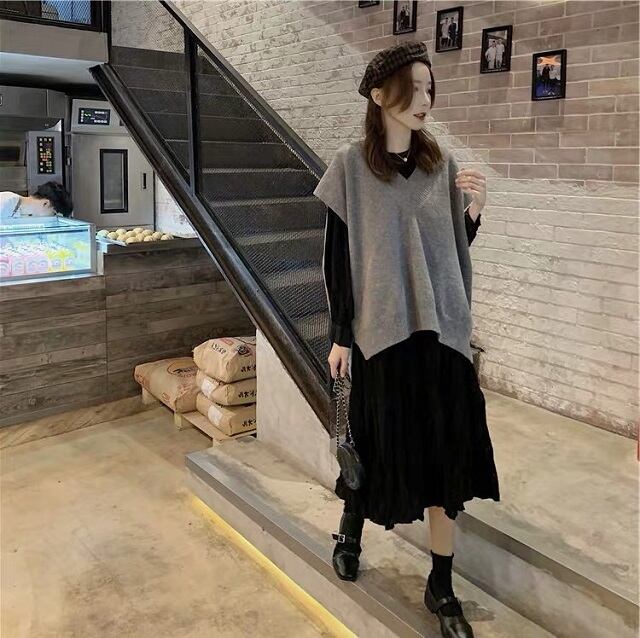 ニットベスト×ロングワンピースのアンサンブルセットです。