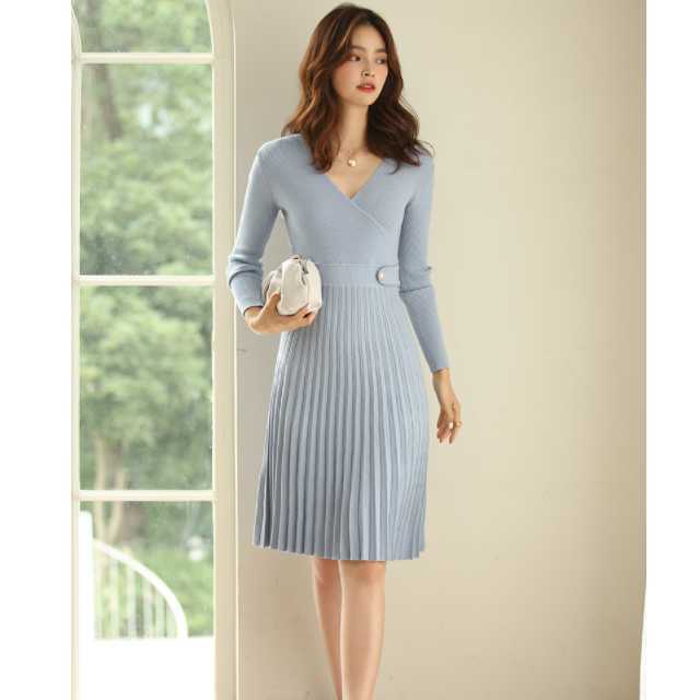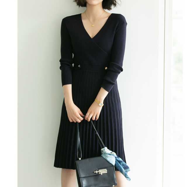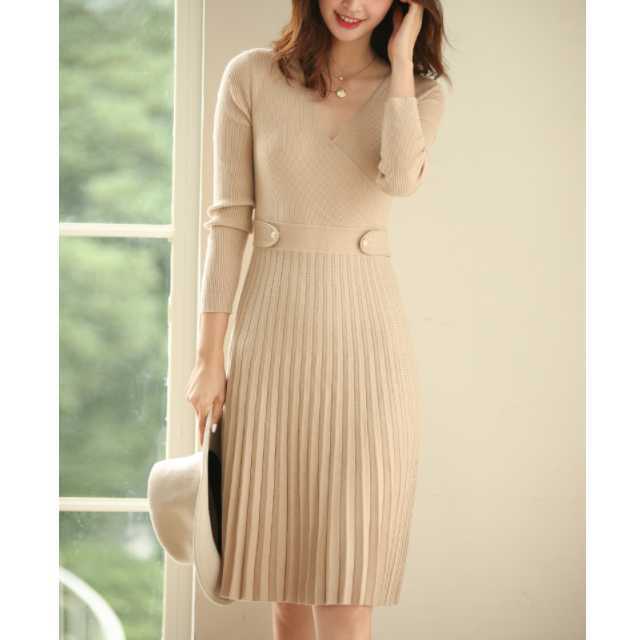 ≪入荷待ち≫ワンピース ニットワンピース 長袖 ワンピース ミモレ丈ワンピース ミモレ丈 レディース ニット カシュクール ウエスト切り替え Vネック ハイウエスト タブベルト 飾りボタン リブ プリーツ ひざ丈 秋 冬 春 全4色 キレセク