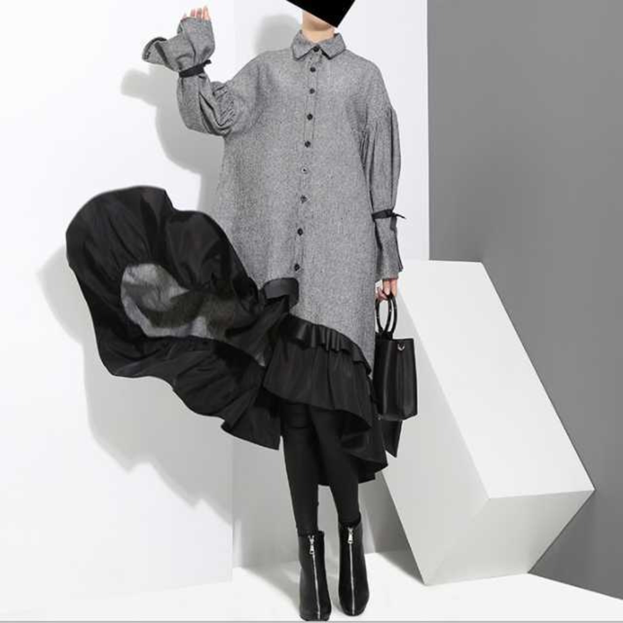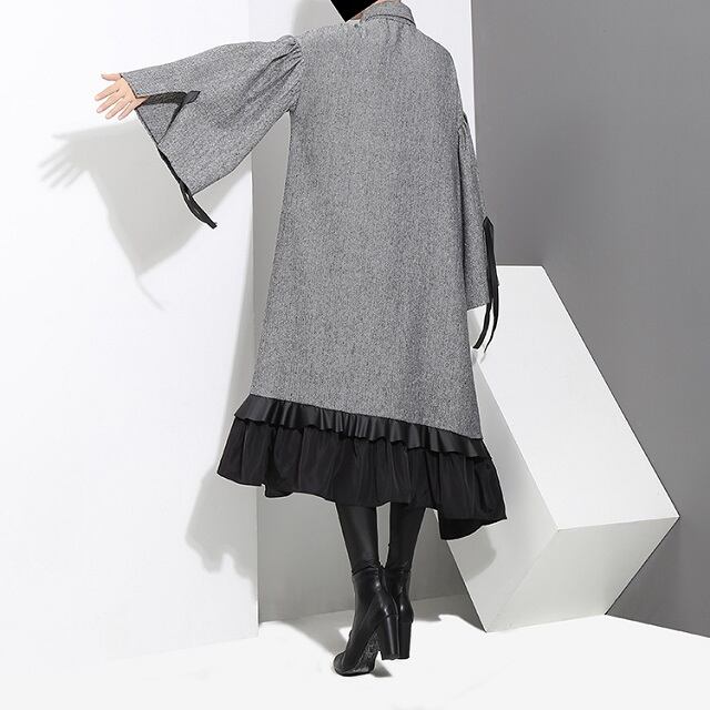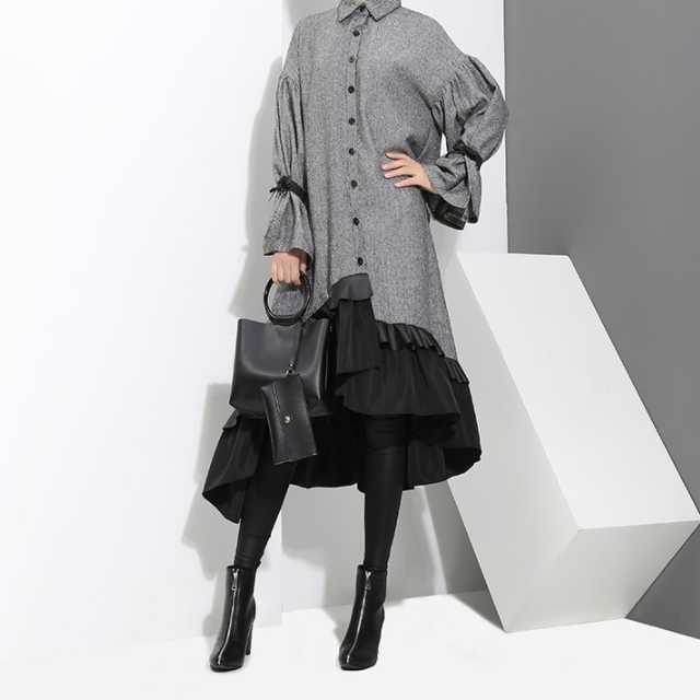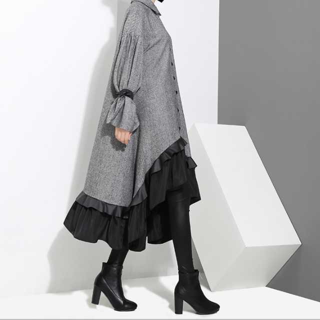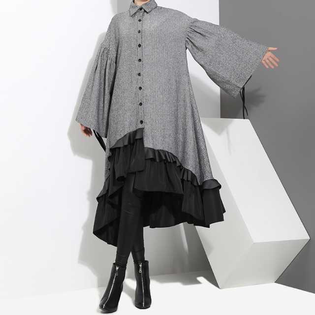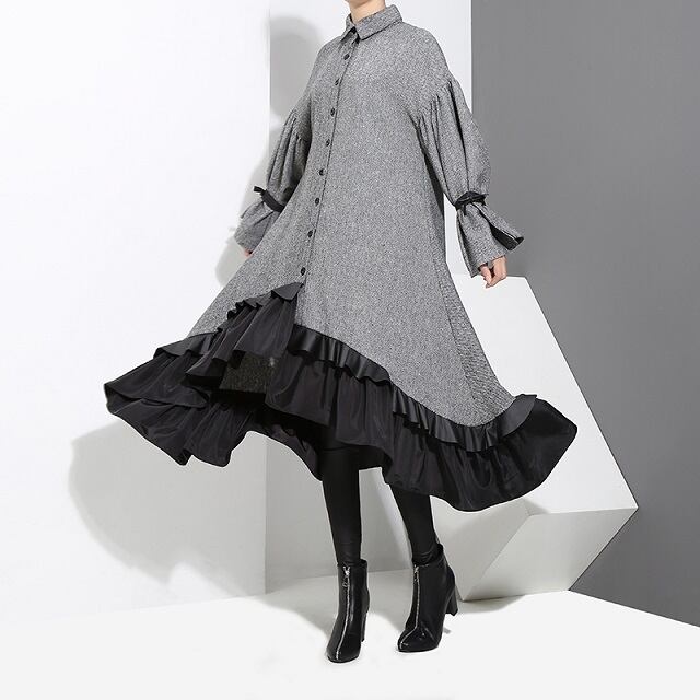 《入荷待ち》ワンピース アシンメトリー フレアワンピース 長袖 秋冬 レディース シャツワンピース フィッシュテール モード系 裾フリルワンピース ロングワンピ フレアワンピ マキシ丈 きれいめ キレセク