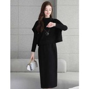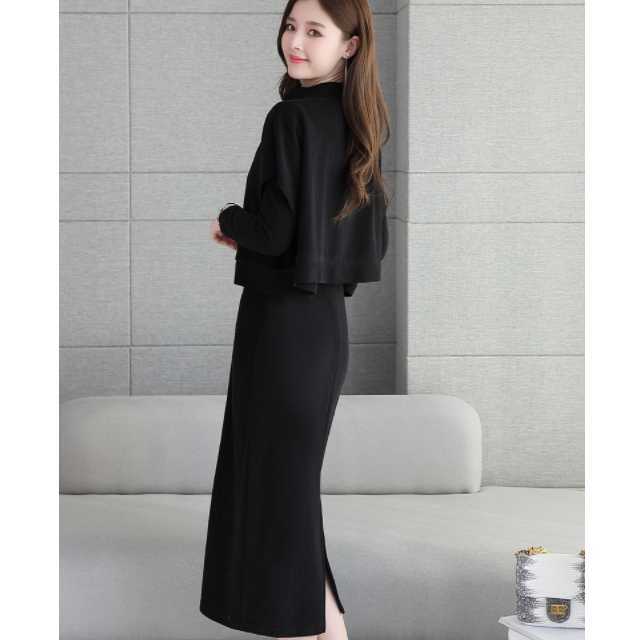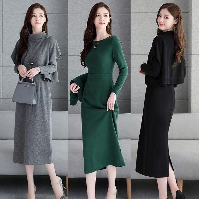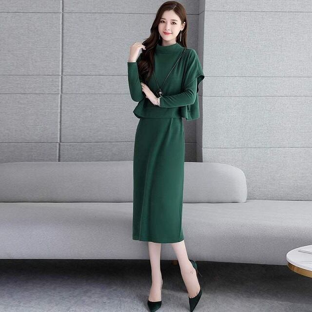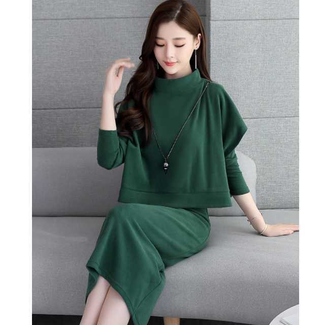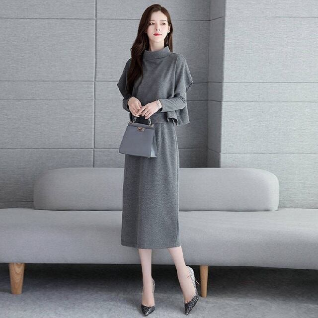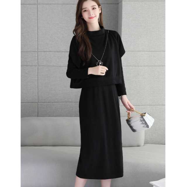 《入荷待ち》セットアップ ワンピース 2点セット セットアップワンピース ミディアム ミディアムワンピース ベスト ポンチョ ハイネック ラウンドネック シンプル きれいめ 長袖 大人 ロング マキシ丈 秋冬 冬 大きいサイズ レディース 全3色 キレセク