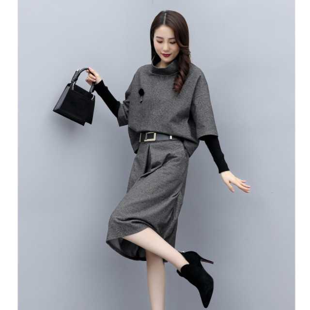 セットアップ スカートセット レディース スカートスーツ トップス 重ね着 ひざ丈 ハイネック ウエストゴム 通勤 オフィスカジュアル ビジネス キレセク