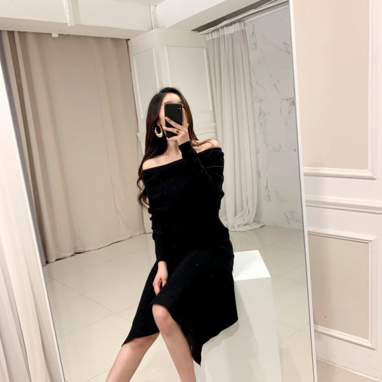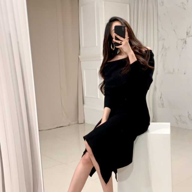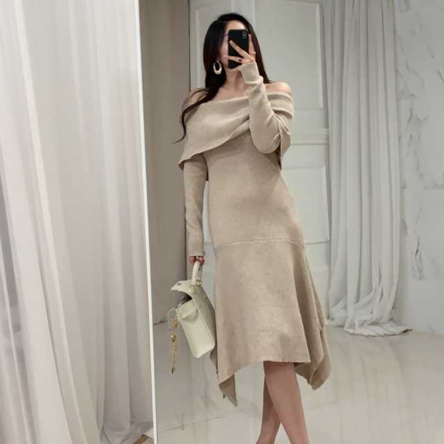 《入荷待ち》ワンピース ニットワンピース タイトワンピース ドレスワンピース 長袖 ロングワンピース きれいめ セクシー 着痩せ オフショルダー ロング丈 アシンメトリー パーティドレス 上品 フォーマル エレガント 全2色 キレセク