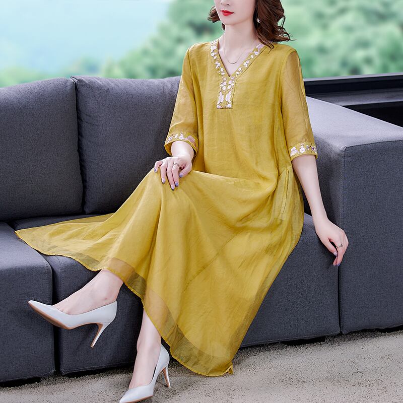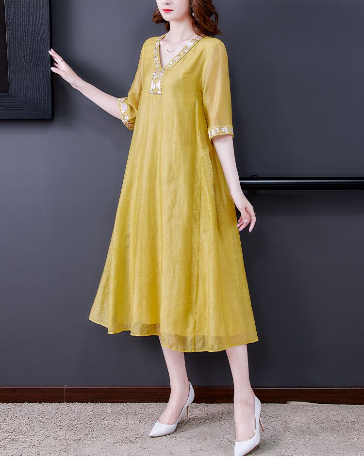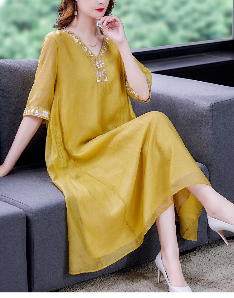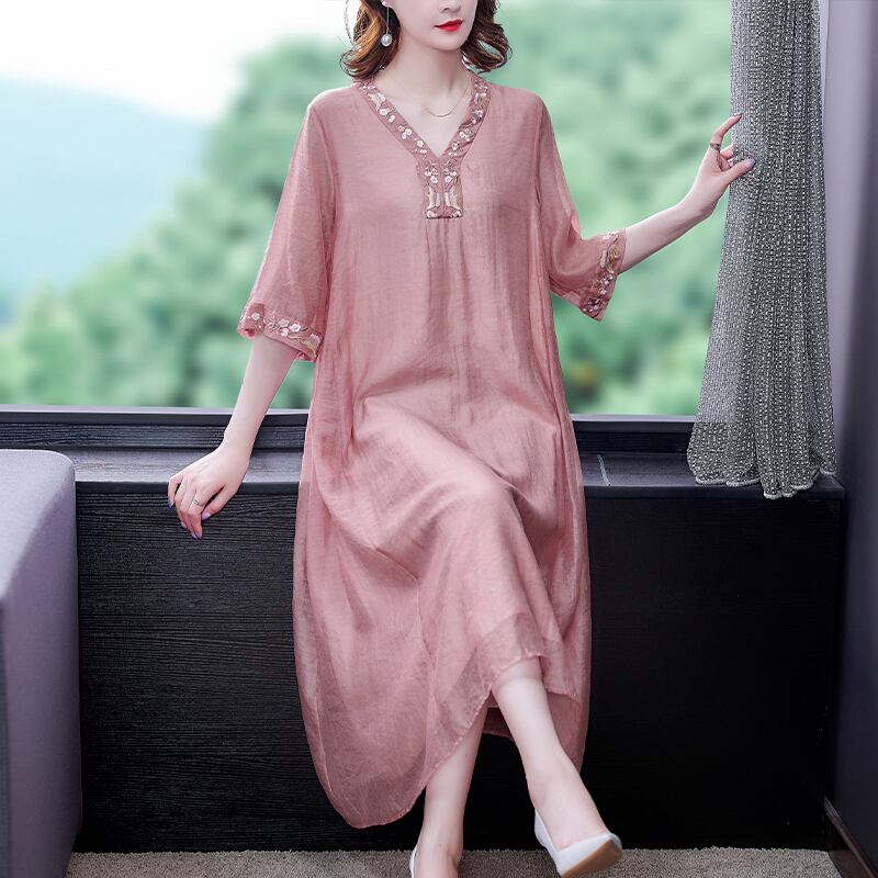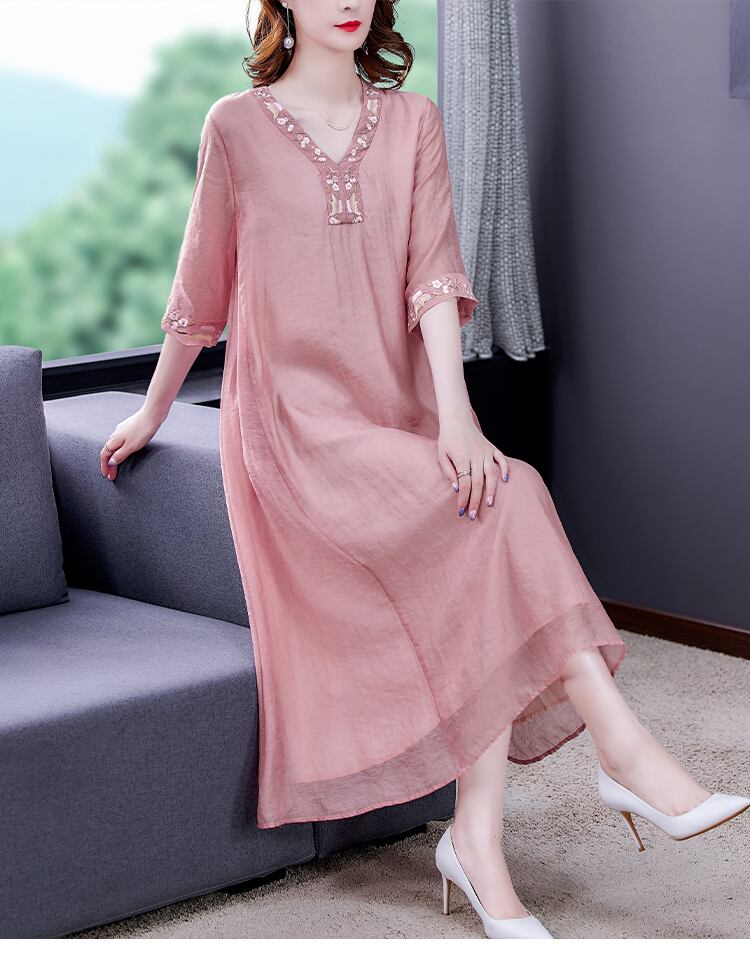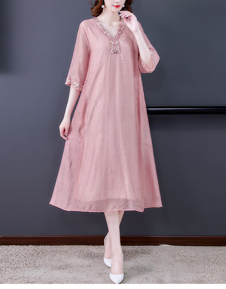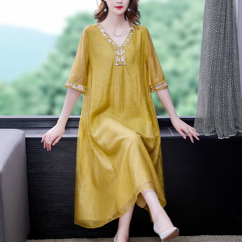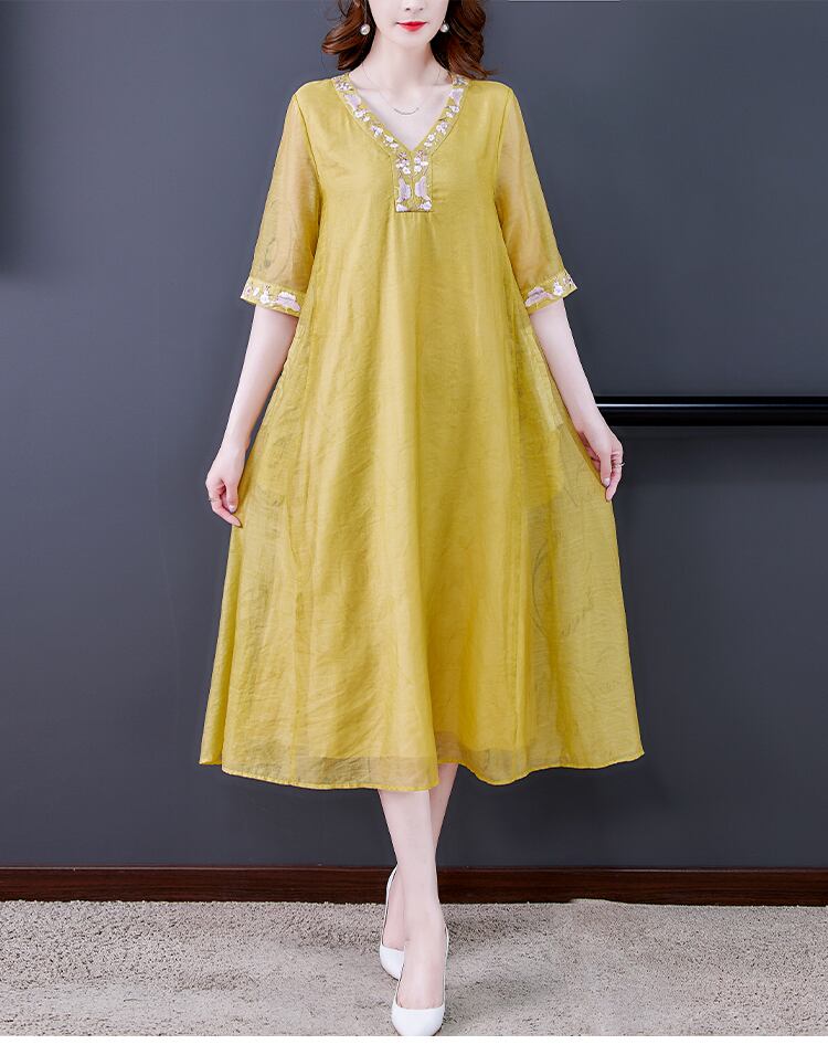 ワンピース 刺繍 ミディ丈 シースルー 透け感 Vネック 無地 半袖 フェミニン きれいめ ナチュラル デート 通勤 ショッピング 春 夏 秋 大きいサイズ かわ大 キレナチュ