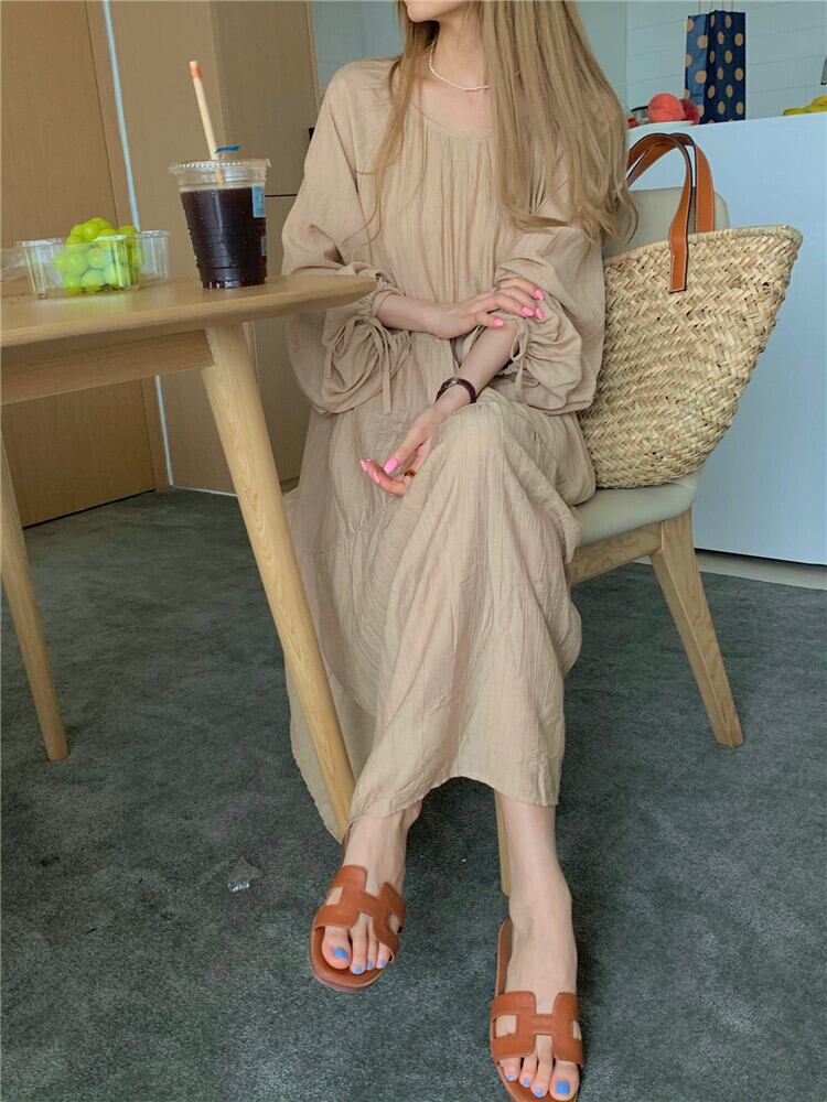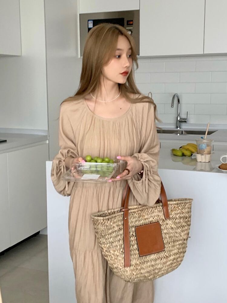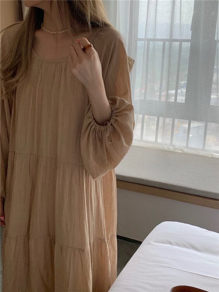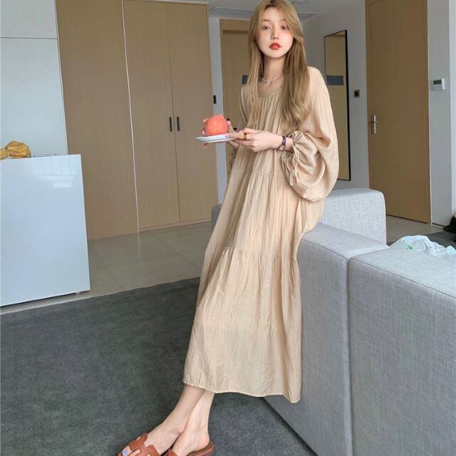 《入荷待ち》ワンピース ボリューム袖 ティアード ミディ丈 ミモレ丈 ラウンドネック 無地 長袖 ゆったり 体型カバー フェミニン きれいめ ナチュラル デート お出かけ ショッピング 春 夏 秋 キレナチュ