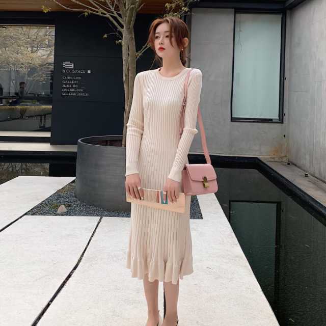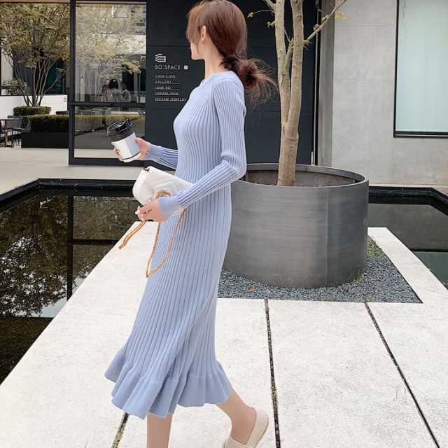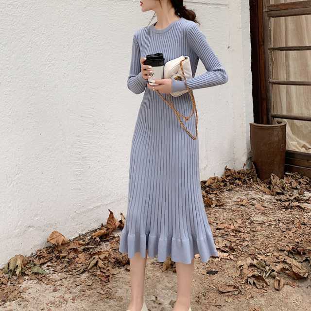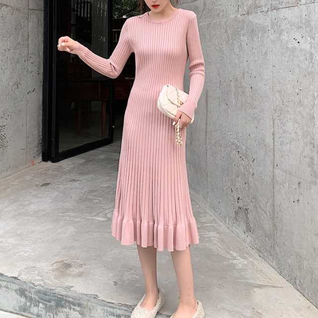 ワンピース ニットワンピース ロングワンピース ラウンドネック 長袖 フリル ロング丈 Aライン フリル 着痩せ お呼ばれ ミドル丈 パーティドレス 上品 エレガント 全4色 キレセク