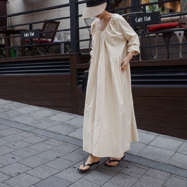 ワンピース ロングワンピ aライン バックシャン 黒 白 無地 綿麻 長袖 ラウンドネック 背中見せ ロング丈 マキシ丈 きれいめ フェミニン ナチュラル 春 夏 秋 小さいサイズ 大きいサイズ キレナチュ