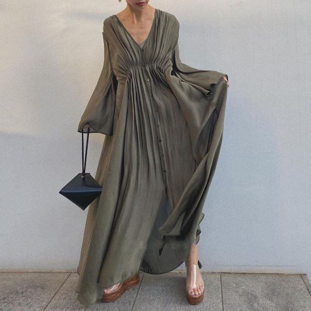 ワンピース マキシワンピ aライン 光沢 上品 無地 長袖 Vネック フレアスリーブ ロング丈 マキシ丈 きれいめ ナチュラル 春 秋 キレナチュ