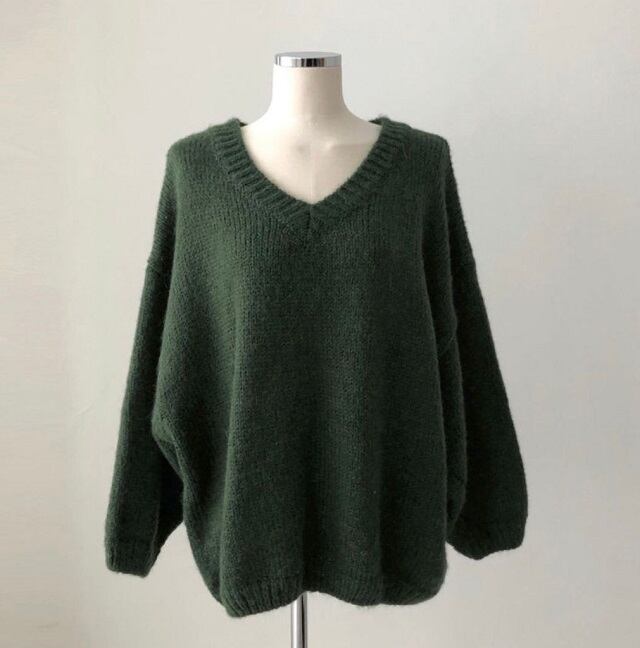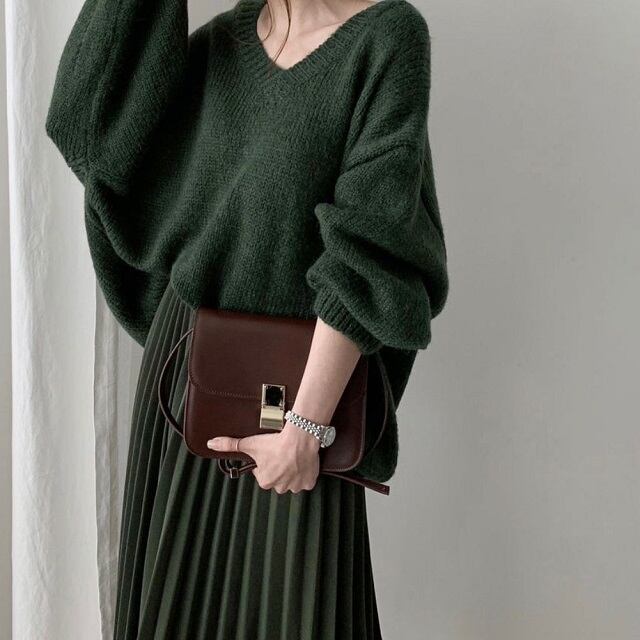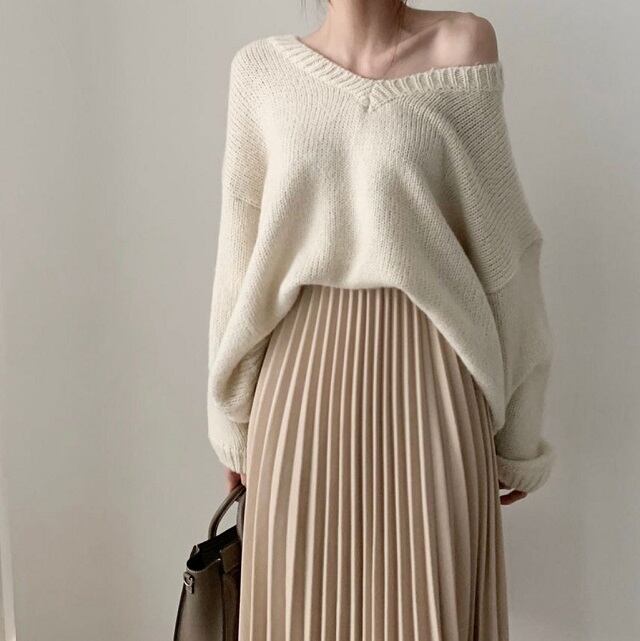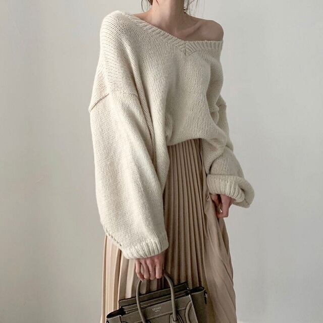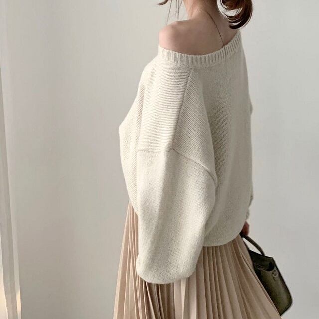 程よくルーズ感を感じさせるニットはオーバーサイズだから、オフショルダー風に着崩してもとってもお洒落。
