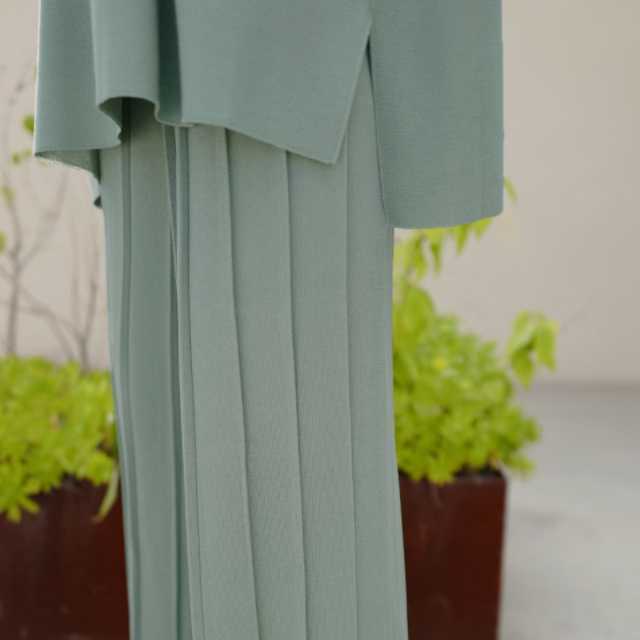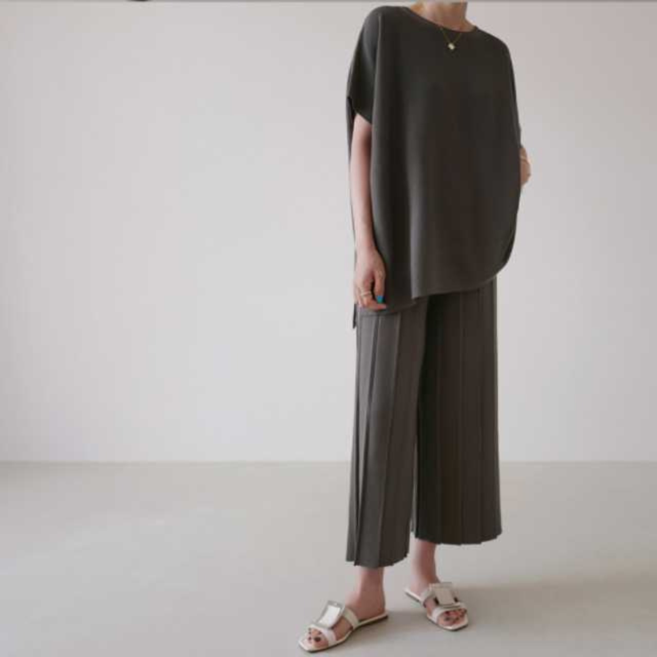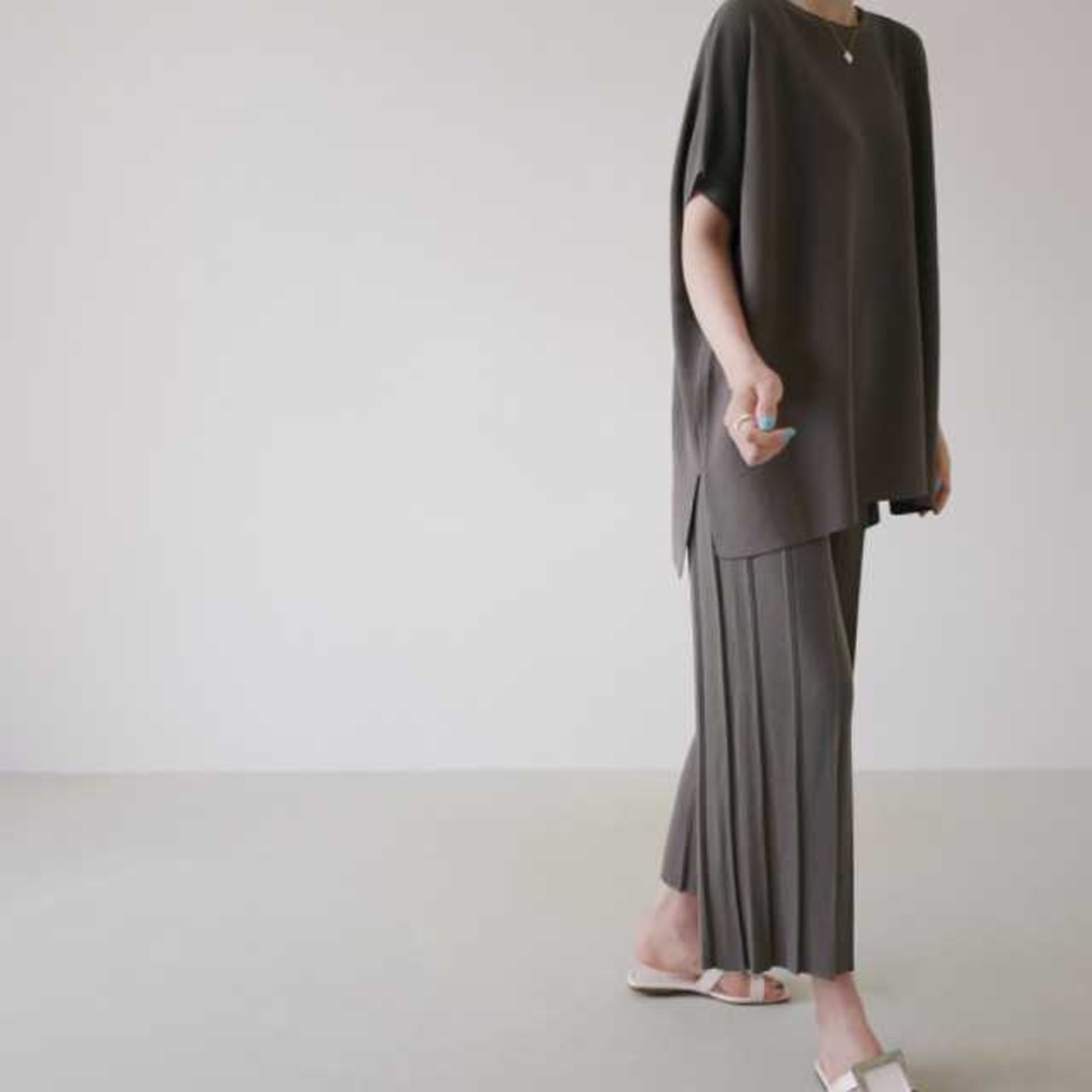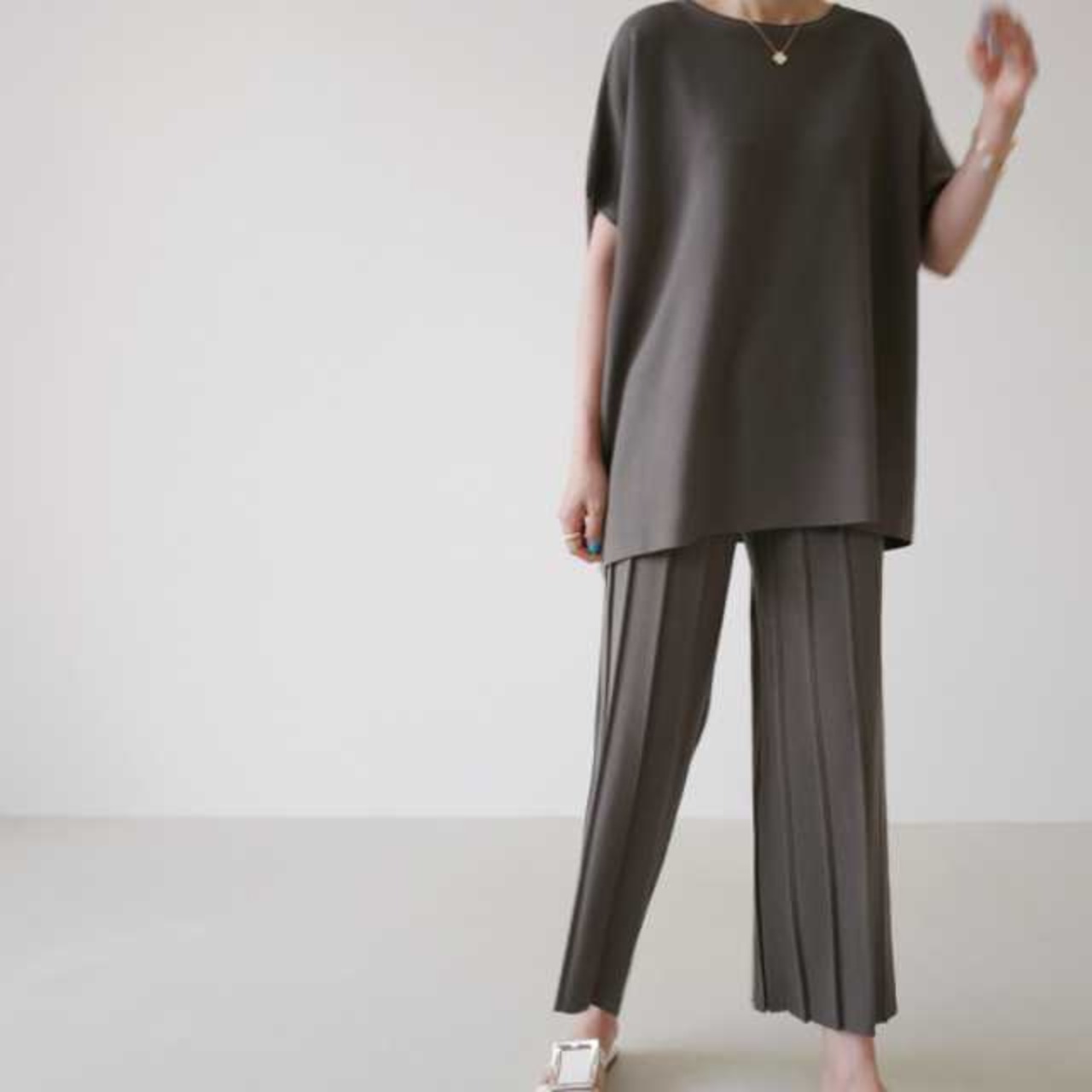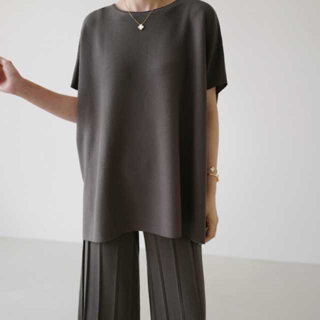 プリーツ加工を施したパンツが大人キュート感を演出。