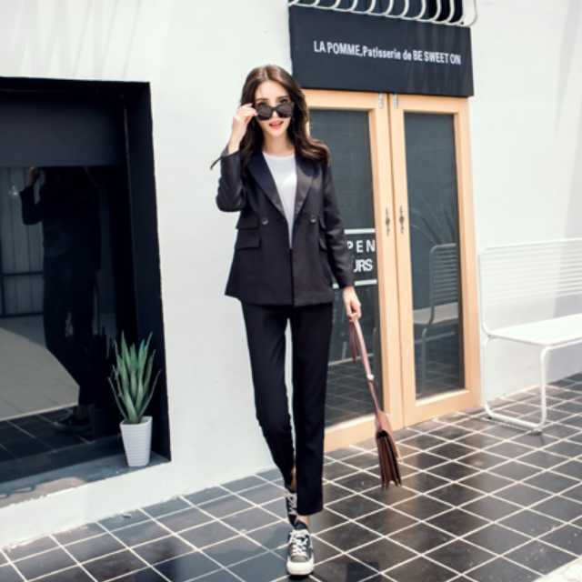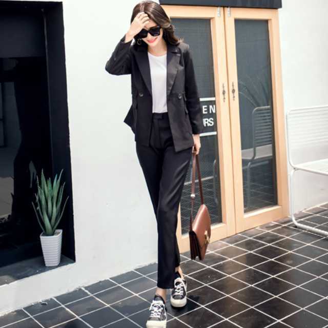 すっきりとしたデザインでフォーマルにもカジュアルにも着こなせるパンツスーツのセットアップ♪