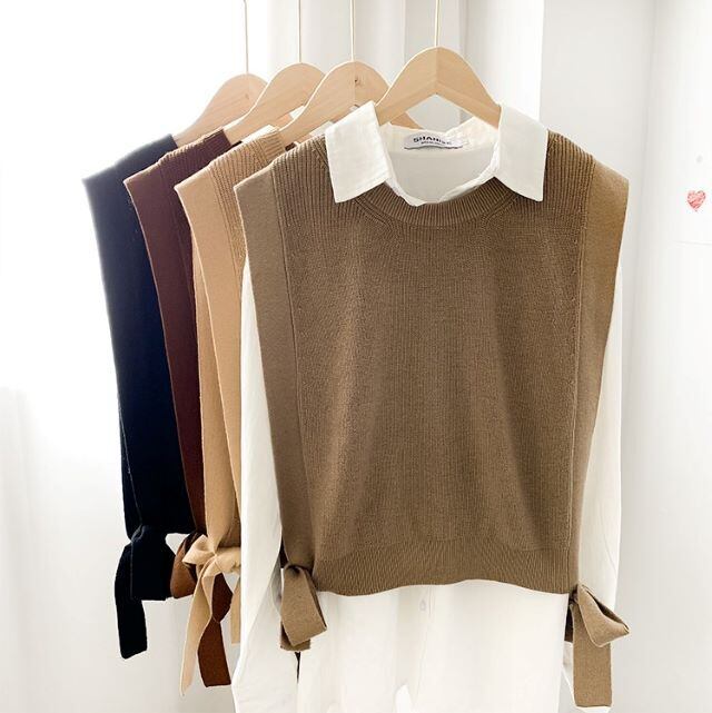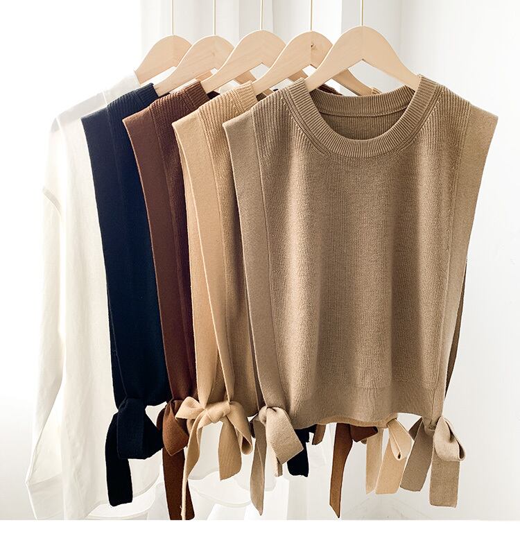 ニットベスト リボン ベスト ラウンドネック トップス 無地 レディース フェミニン ナチュラル シンプル カジュアル ショッピング お出かけ 通勤 デイリー 黒 秋 冬 キレナチュ