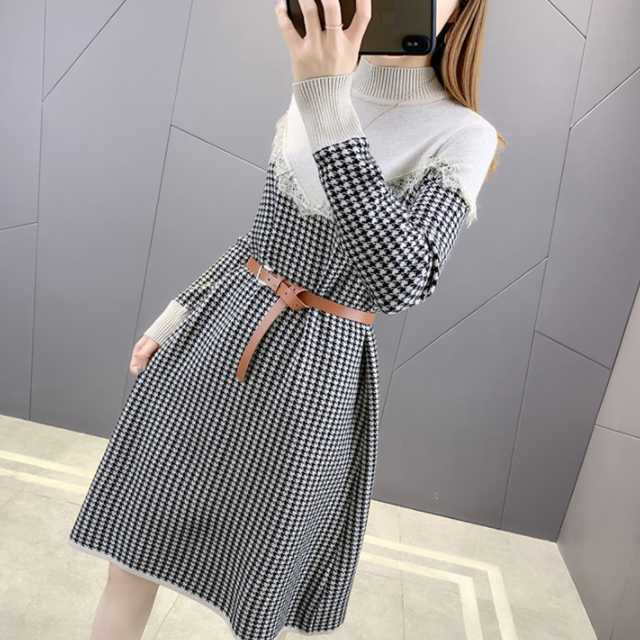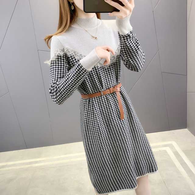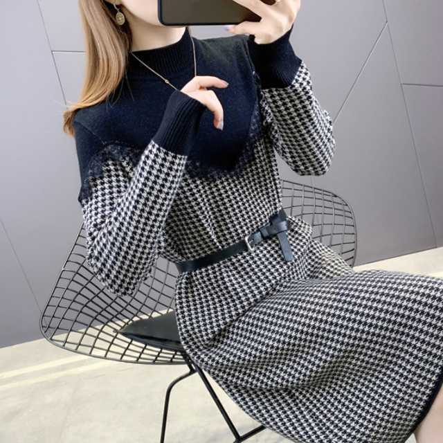 ワンピース ニットワンピース 千鳥格子 チェック柄 ハイネック 秋 冬 春 長袖 ひざ丈 レース ニットワンピ ガーリー ゆったりめ レトロ 上品 きれいめ 清楚 クラシック キレセク