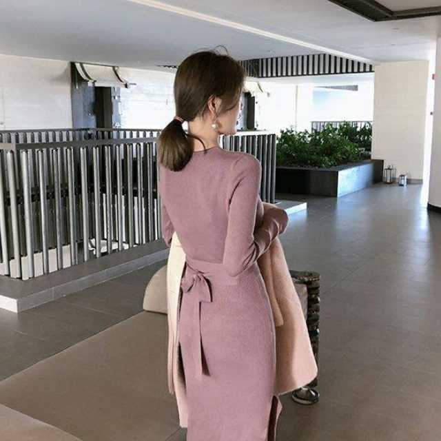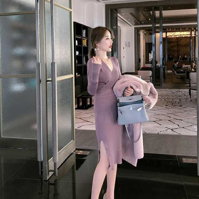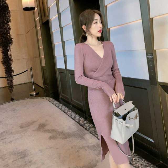 《入荷待ち》ワンピース ニットワンピース タイトワンピース ニットタイトワンピース カシュクール風 オフィスカジュアル カジュアルワンピース きれいめ 膝丈 Vネック ウエストマーク エレガント キレセク