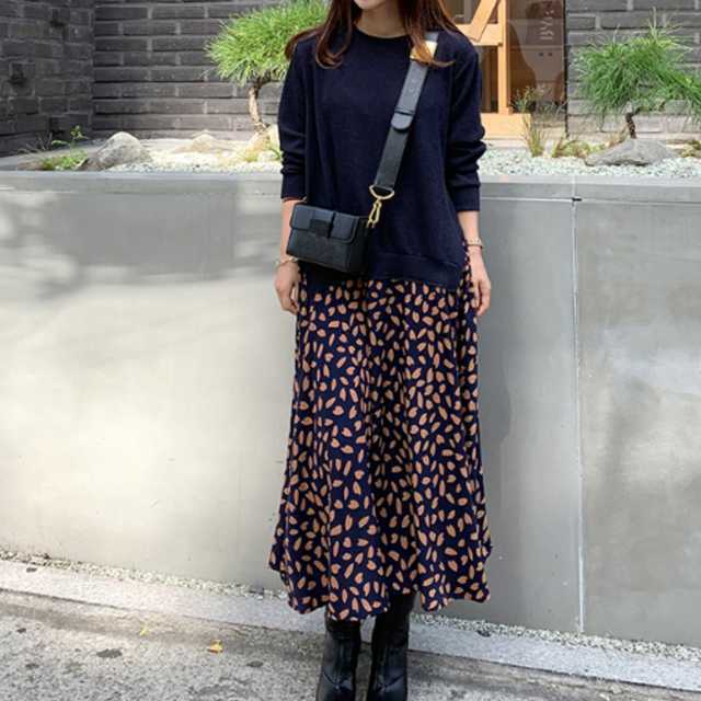 ニット素材にスッキリとしたフレアスカートをドッキングさせたロングワンピース♪