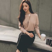 首元の大きなボタンがひときわ目を引くデザイン。シワになりにくい生地が高級感を感じさせます。