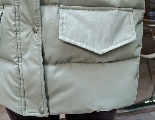 コロンとしたフードがかわいい、オーバーサイズのダウンベスト。