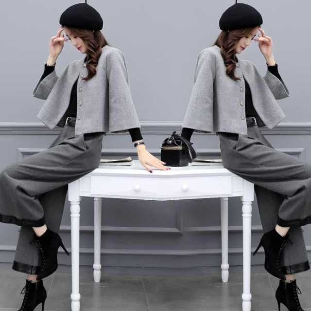 セットアップ ジャケット ワイドパンツ レディース 2点セット 厚手 アウター カーディガン パンツ ワイドパンツ ガウチョパンツ ケープ ケープスリーブ 七分袖 カーディガン カジュアル キレセク