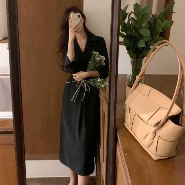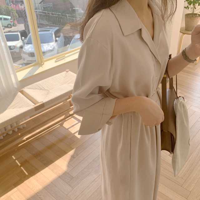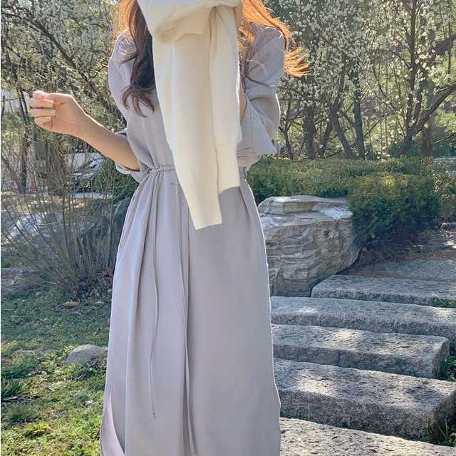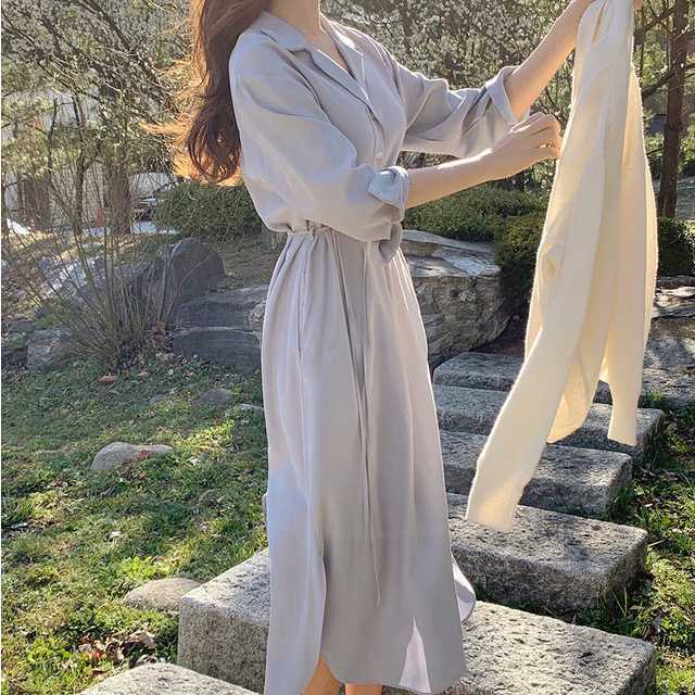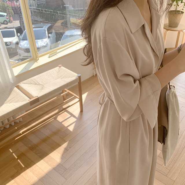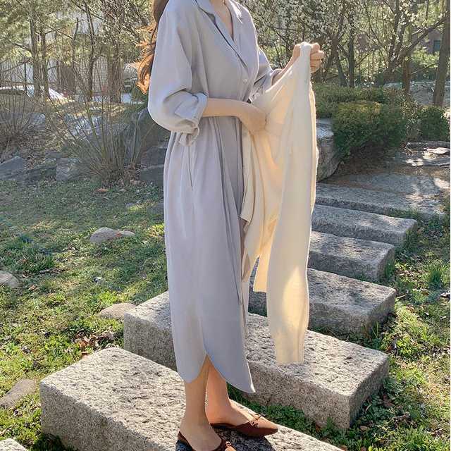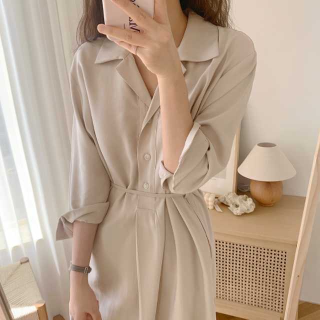 ワンピース シャツワンピース レディース マキシ丈 ロング丈 七分袖 スタンドカラー Vネック シャツワンピ ウエストマーク 無地 ストライプ きれいめ 大人ワンピ 春 夏 キレセク