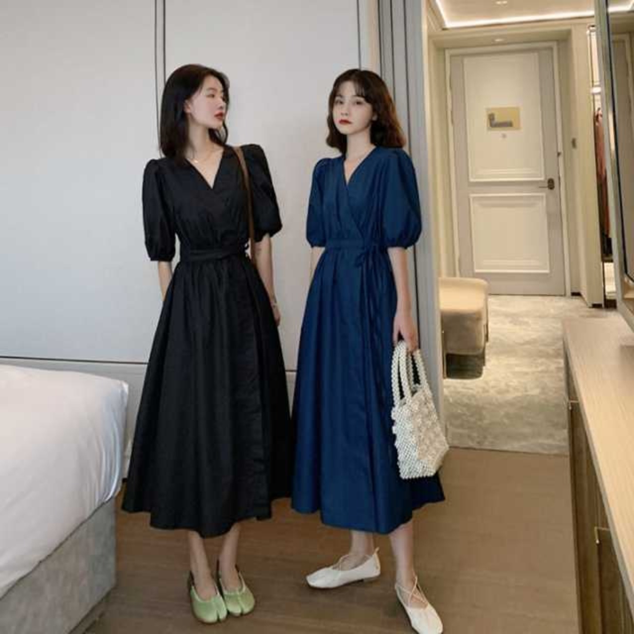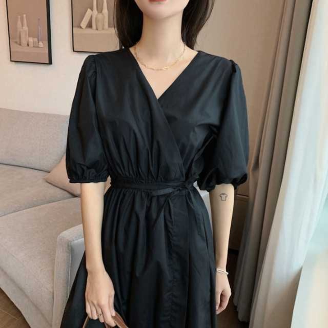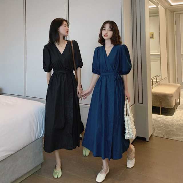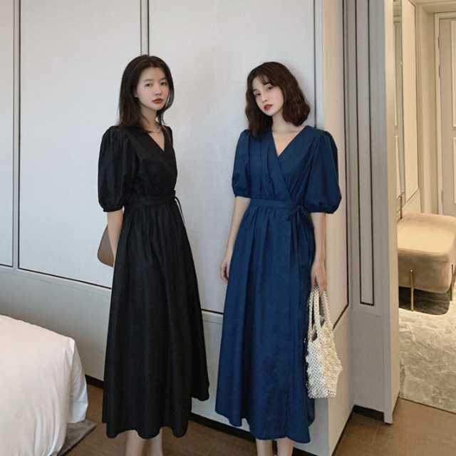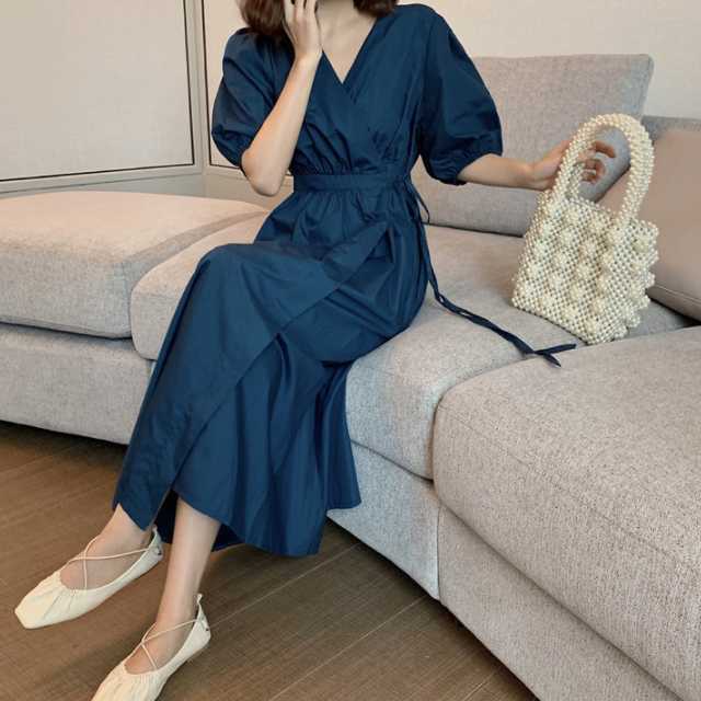 ワンピース カシュクールワンピース カシュクール 春 きれいめ 夏 レディース ミモレ丈 パフスリーブ ギャザースリーブ ボタン Vネック Aライン フレア ドレッシー 大きめサイズ キレセク