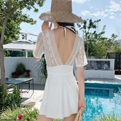 水着 ワンピース レース バックコンシャス 背中見せ 袖 体系カバー Vネック セクシー 海 ビーチ プール 海水浴 リゾート ママ キレセク