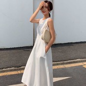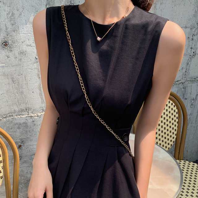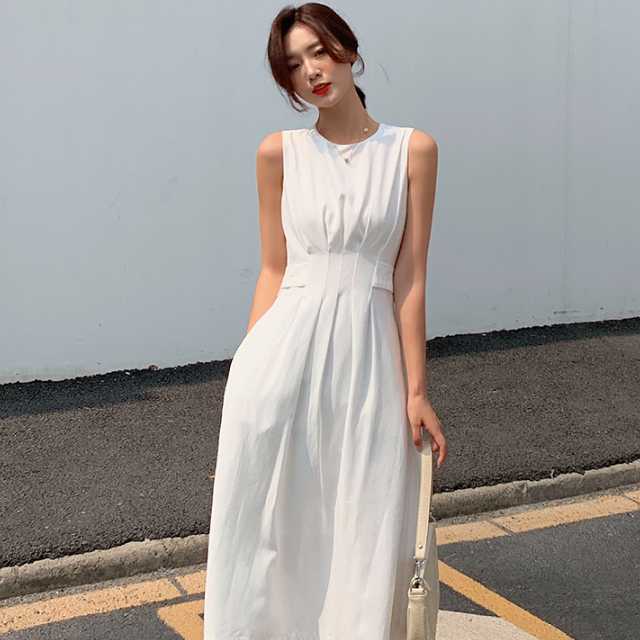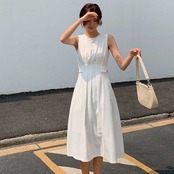 ハイウエストのウエストマークが足長効果を感じさせるノースリーブワンピース♪