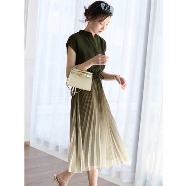 ワンピース プリーツワンピース レディース ミディアム丈 ミモレ丈 グラデーションカラー スキッパーネック 半袖 フレンチスリーブ プリーツスカート ウエストギャザー ウエストリボン 春 夏 大きいサイズ キレセク